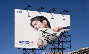 بیلبورد خمیردندانformula:این بیلبورد با ایدهای خلاقانه، قدرت و کارایی خمیردندان را به نمایش میگذارد. تصویر مردی که با دندان در حال پاره کردن بیلبورد است، به شکلی اغراقآمیز، قدرت و استحکام دندانها را القا میکند. رنگهای روشن و سفید، حس تمیزی و بهداشت را به بیننده منتقل میکنند. پیام اصلی این بیلبورد، “دندانهای قوی را میسازد” است که به طور واضح، مزیت اصلی محصول را بیان میکند.