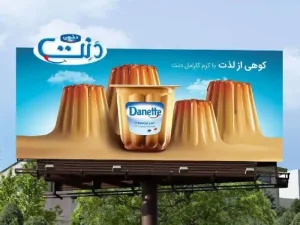 بیلبورد دنت با طعم کارامل: این بیلبورد با تمرکز بر القای حس لذت و خوشمزگی، تپههایی از دسر کاراملی دنت را به تصویر کشیده است. رنگهای گرم و اشتهاآور کاراملی در کنار تصویر جذاب محصول، سعی در تحریک حس چشایی مخاطب دارند. آسمان آبی روشن به عنوان پسزمینه، حس تازگی و شادابی را به این تصویر اضافه میکند. پیام اصلی این بیلبورد، “کوهی از لذت با کرم کارامل دنت” است که به سادگی و به طور مستقیم، هدف تبلیغاتی را بیان میکند.